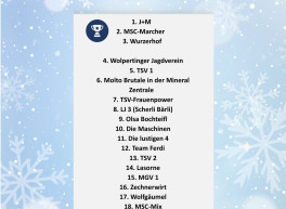 Vielen Dank für die zahlreichen Anmeldungen zu unserem Eisstockschießen! Mit 26 Teams war die Beteiligung dieses Jahr besonders groß – das freut uns sehr. Herzlichen Glückwunsch an die Gewinner! Ein großes Dankeschön geht außerdem an alle Mitwirkenden und Sponsoren, die diese Veranstaltung möglich gemacht haben. Wir freuen uns schon auf das nächste Jahr!