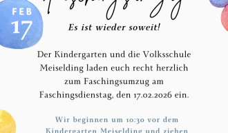 Der Kindergarten und die Volksschule Meiselding laden euch recht herzlich zum Faschingsumzug am Faschingsdienstag, den 17.02.2026 ein.