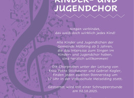 - Alle Kinder & Jugendlichen ab 5 Jahren sind herzlich willkommen - Chorproben: jeden 2. Donnerstag, 17 Uhr, Volksschule Meiselding - Leitung: Petra Stichauner & Gabriel Kogler ✨ Schnupperstunde: 02.10.2025 ✨